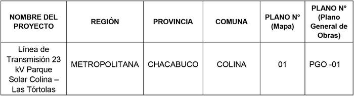 La Línea de transmisión proyectada se extenderá aproximadamente por 8.540 metros, iniciándose en el Parque Fotovoltaico Colina, comuna de Colina, provincia de Chacabuco y Región Metropolitana, y cruzando de forma subterránea la Circunvalación Chacabuco Norte E19N, continua vía aérea en dirección sur atravesando los terrenos de propiedades particulares, discurriendo próxima y/o paralela al camino existente, hasta finalizar su recorrido en la Subestación Las Tórtolas, existente, de propiedad de Colbún Trasmisión S.A., comuna de Colina, provincia de Chacabuco, Región Metropolitana. La determinación del número de circuitos de la línea de transmisión se encuentra sujeta a estudios actualmente en curso.