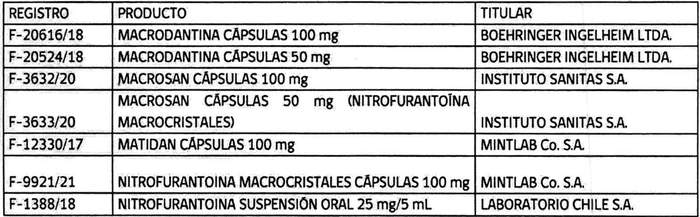1. La alerta informativa de la Agencia Española de Medicamentos y Productos Sanitarios (AEMPS), del 22 de julio de 2016, que comunicó la notificación de reacciones adversas graves, especialmente pulmonares (fibrosis, neumonitis intersticial) o hepáticas (hepatitis citolítica, hepatitis colestásica, hepatitis crónica, cirrosis), en tratamientos profilácticos prolongados o intermitentes de meses de duración con nitrofurantoína, y en consecuencia, fueron restringidas las indicaciones de uso y la duración de tratamiento, estando indicada en adelante para su uso exclusivo en el tratamiento curativo de cistitis agudas, no como profilaxis, con duración del tratamiento limitado a un máximo de 7 días, en mujeres a partir de los 3 meses de edad.