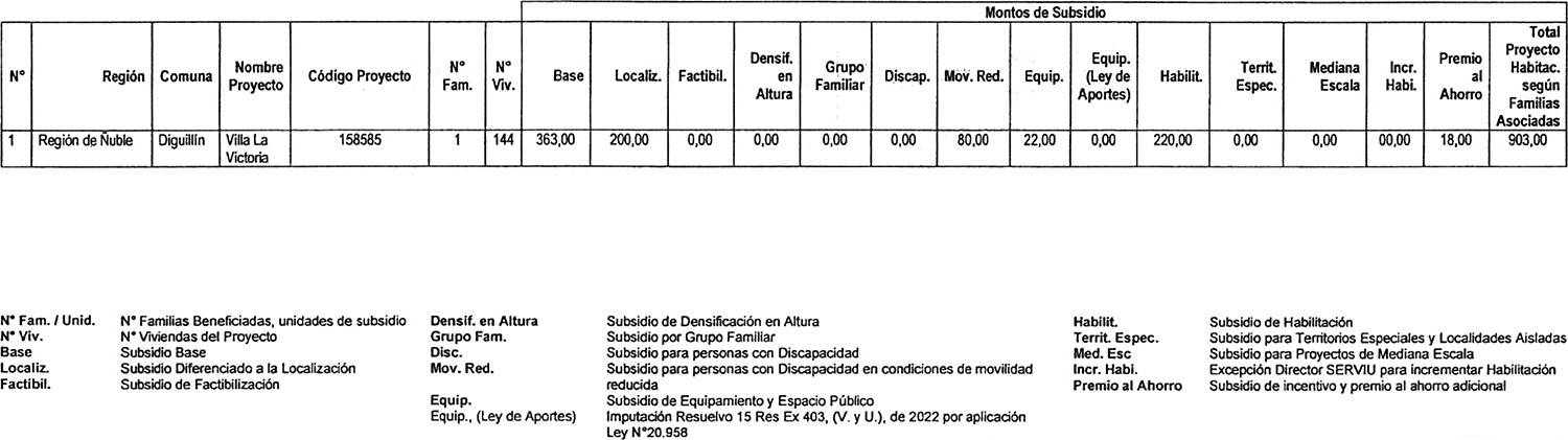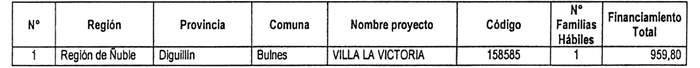 1. Apruébase la selección del proyecto que se indica, con su respectivo financiamiento total, para el otorgamiento de subsidios del Programa Habitacional Fondo Solidario de Elección de Vivienda en la alternativa de postulación colectiva, para el proyecto de Construcción en Nuevos Terrenos, en la Región de Ñuble, correspondiente al proceso de selección cuyo cierre de postulación se verificó el día 5 de julio de 2022, del llamado efectuado por resolución exenta N° 399 (V. y U.), de 2022: