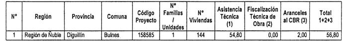 2. El monto del subsidio asignado de conformidad con el cuadro del Resuelvo 1. de esta resolución comprende los siguientes valores por concepto de Servicios de Asistencia Técnica, de Labores de Fiscalización Técnica de Obra y Pago de Aranceles al Conservador de Bienes Raíces: