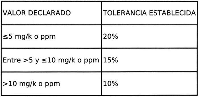 Sobrepasada esta tolerancia, el interesado podrá hacer uso de las contramuestras o en su defecto reetiquetar a los valores determinados por el resultado de análisis de composición. Dicho reetiquetado se hará exigible cuando los valores superen los 3,0 mg/kg en metales pesados y 0,12% en Biuret.