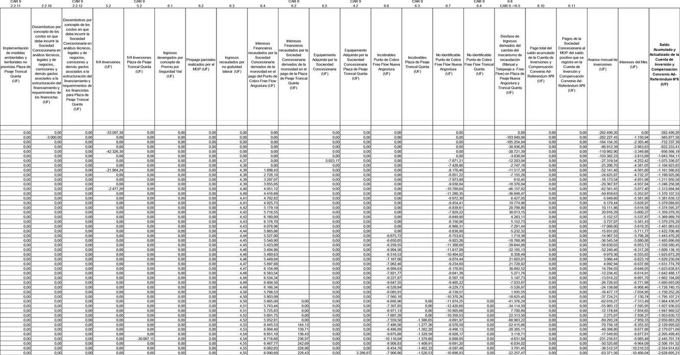 5.1.2 Las partes acuerdan que a partir del mes subsiguiente a la entrada en vigencia del presente Convenio, la Sociedad Concesionaria deberá presentar un detalle de todas las inversiones, gastos y costos del mes anterior, determinado sobre la base de los montos señalados en las cláusulas segunda y cuarta del presente Convenio, en el mismo informe que se señala en el numeral 5.1.2 del Convenio Ad-Referéndum N° 8, de 2018.