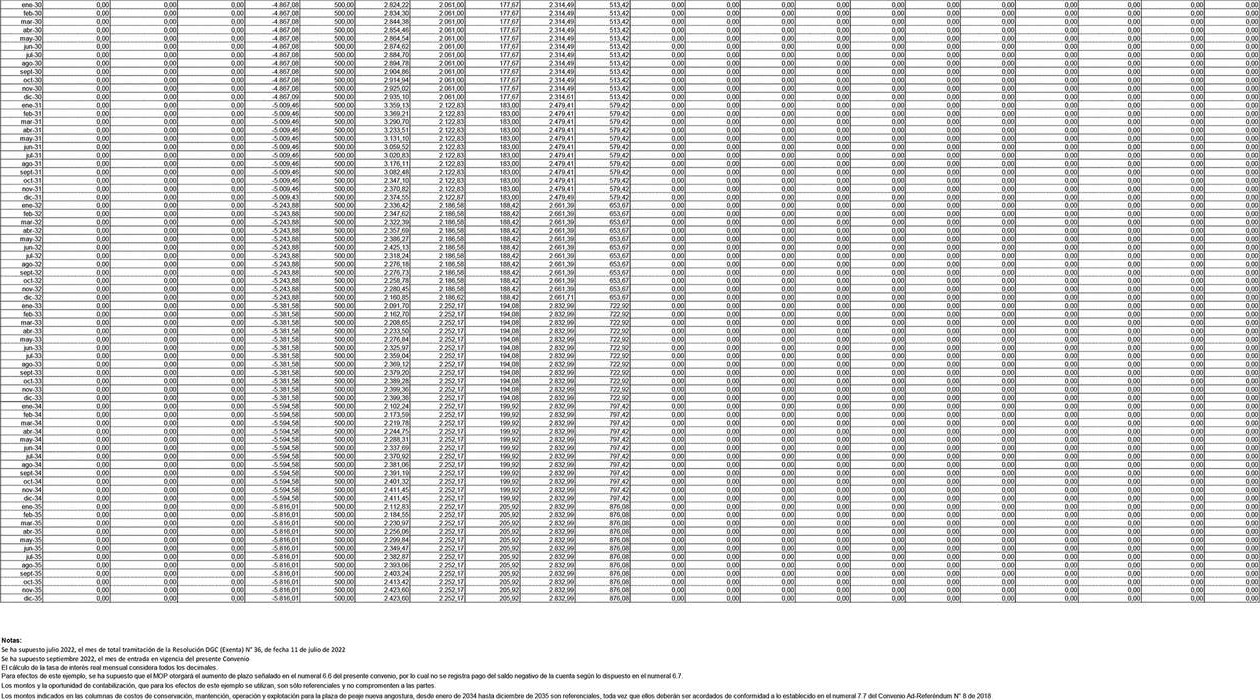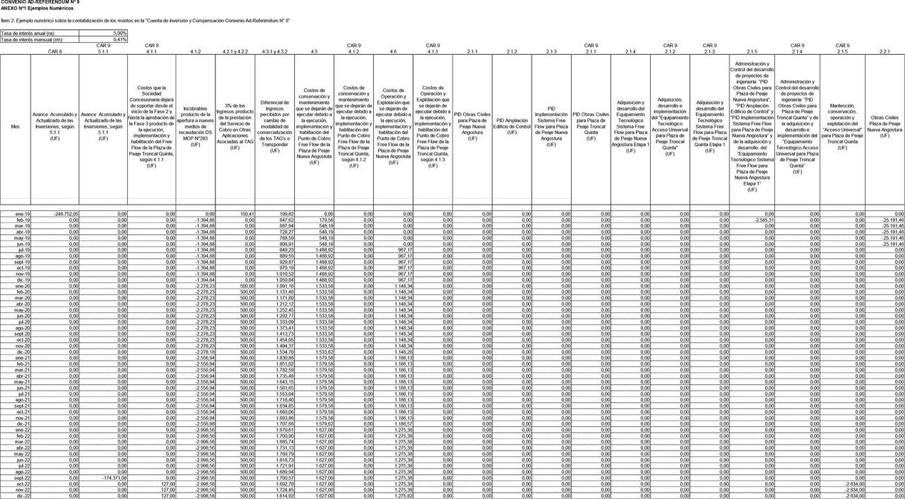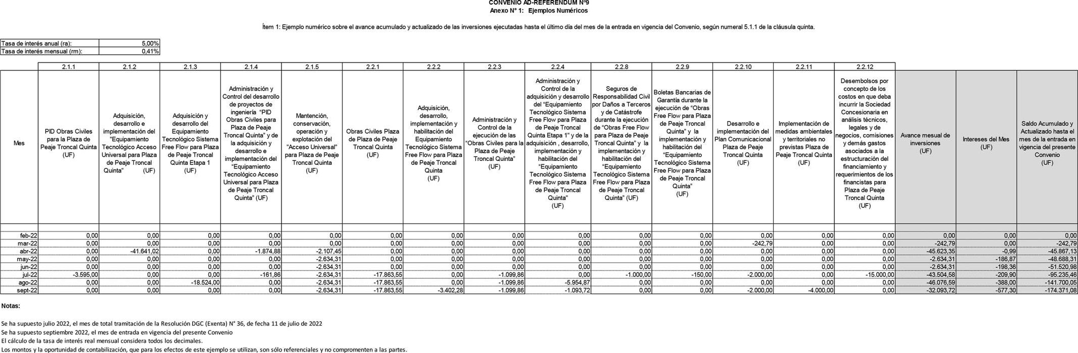Para una mejor comprensión del procedimiento señalado en el presente numeral, se adjunta como Ítem 1 del Anexo N° 1, un ejemplo numérico sobre el avance acumulado y actualizado de las inversiones, gastos y costos ejecutados hasta el último día del mes de la entrada en vigencia del presente Convenio.