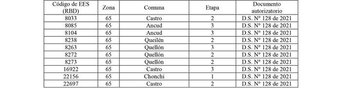 1. Eliminar diez (10) Establecimientos Educacionales Subvencionados (EES), adjudicados en el marco del Concurso Público "Conectividad para la Educación 2030", Código: FDT-2019-04, autorizados por decreto supremo del literal n) de los Vistos, según se indica a continuación: