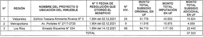 Con todo, el mayor monto de subsidio que se otorga mediante la presente resolución exenta a los proyectos beneficiados mediante las resoluciones citadas en los vistos f) y h), ascendentes a 37.323 Unidades de Fomento, se imputarán a los recursos dispuestos para el año 2022, para el Programa Habitacional Fondo Solidario de Elección de Vivienda, según el detalle y a las regiones indicadas, en el presente cuadro: