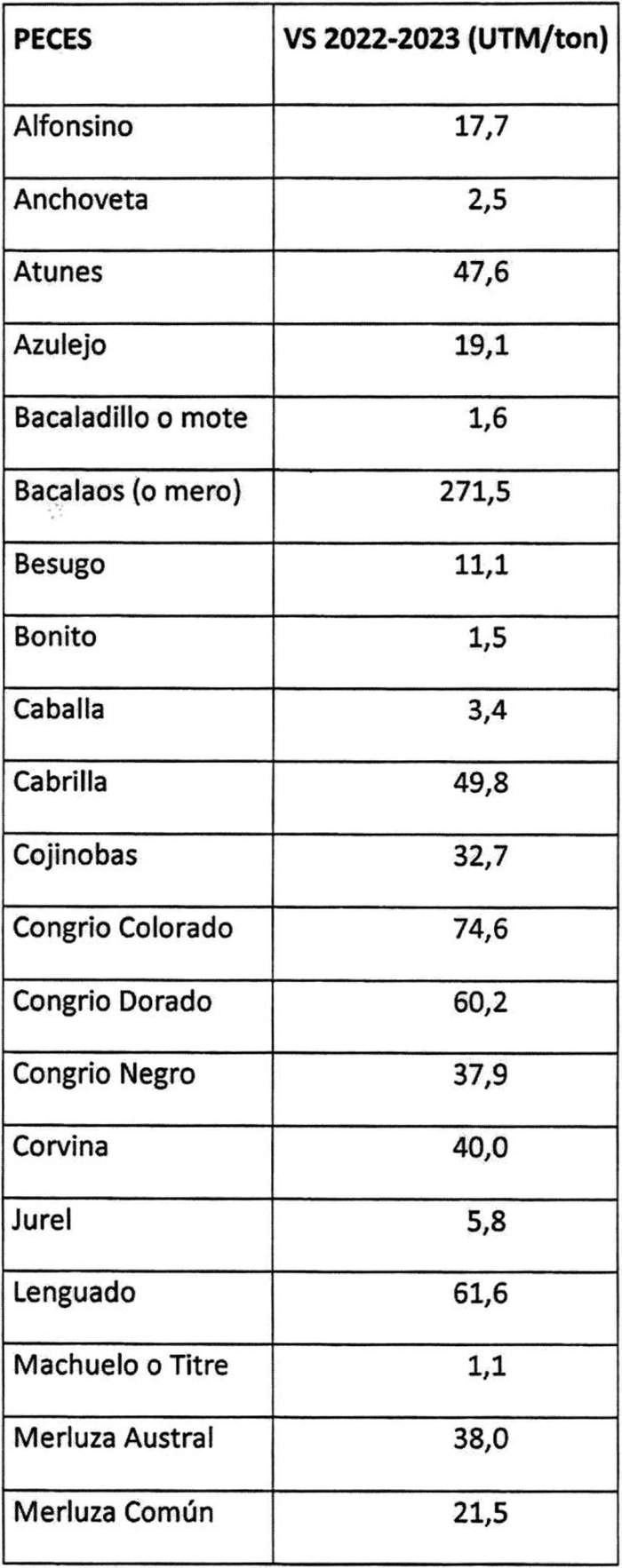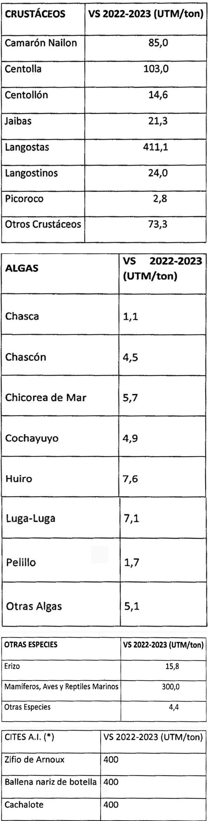 Por decreto exento Nº 57, de 7 de diciembre de 2022, de este Ministerio, fíjanse los valores de sanción de las especies hidrobiológicas que a continuación se indican, los que servirán de unidad de cuenta para los efectos de la aplicación de las sanciones que se establecen en la Ley General de Pesca y Acuicultura:
