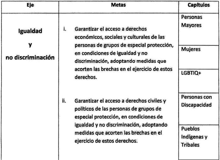 .El eje de Igualdad y no discriminación, que engloba los capítulos relativos a las medidas en favor de la garantía de derechos de personas que pertenecen a grupos de especial protección. Así también se fortalece la visión del principio de igualdad y no discriminación como uno de los rectores de la acción pública.