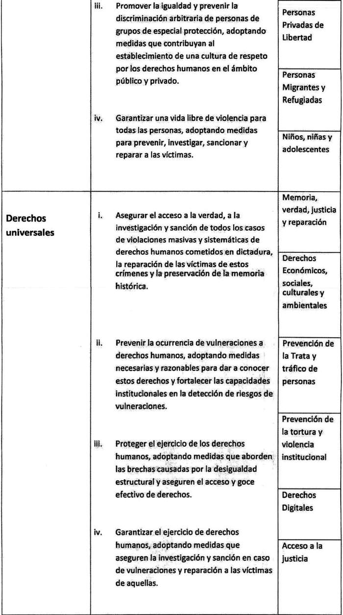 Un segundo cambio fue la definición de metas por ejes y no por capítulos, como fue en la primera versión. Esto obedece, nuevamente, al propósito de destacar y fortalecer la forma en cómo los diversos compromisos contenidos en los capítulos se vinculan entre ellos, pues responden a obligaciones generales del Estado en materia de derechos humanos y a problemáticas que trascienden a un grupo o tema específico. De esta forma, por ejemplo, el compromiso de generar medidas para garantizar una vida libre de violencia es aplicable tanto a la situación de mujeres, de niños, niñas y adolescentes, personas mayores, entre otros, por lo que tiene más sentido destacarlo como una de las metas transversales para dicho eje. En el mismo sentido, la obligación del Estado de prevenir la ocurrencia de vulneraciones a derechos humanos, es aplicable al ejercicio de cualquiera de los derechos y, en particular para este caso, para todos aquellos vinculados al eje de derechos universales, por lo que se plantea como una meta para todos los capítulos que contiene ese eje.