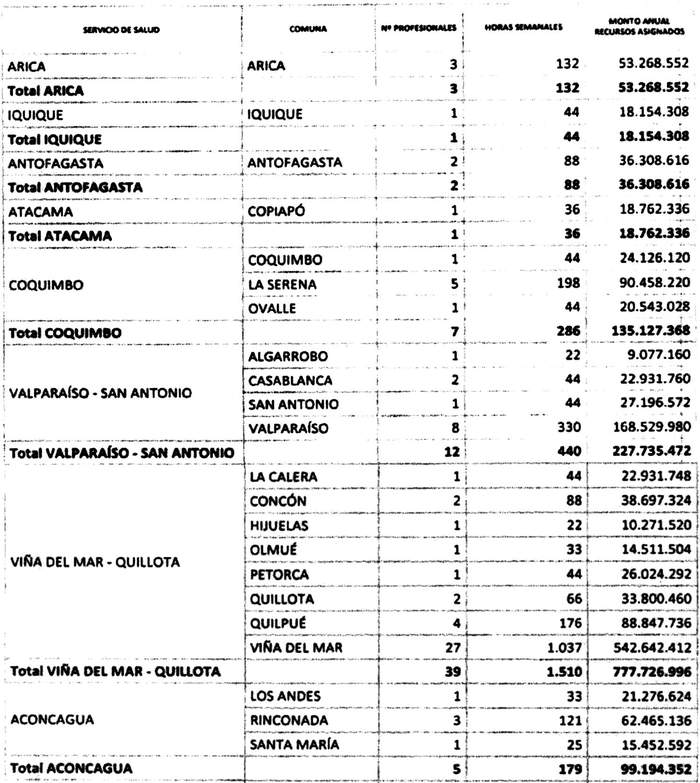 Las entidades administradoras de salud municipal que se indican a continuación, concederán dicha asignación a los médicos cirujanos que cuenten con esta especialidad, para lo que contarán con los siguientes recursos para ello, en atención al número de profesionales y de horas semanales contratadas, conforme se indica a continuación: