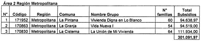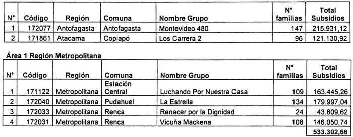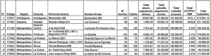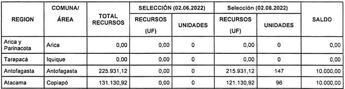 2. Apruébase la selección de los grupos organizados indicados en la siguiente tabla, con su respectivo financiamiento total, el cual incluye los servicios de asistencia técnica, fiscalización técnica de obras y aranceles del Conservador de Bienes Raíces, detallados en el Resuelvo 4. de la presente resolución, para el otorgamiento de subsidios del Programa Habitacional Fondo Solidario de Elección de Vivienda en la alternativa de postulación colectiva, para adquisición de terrenos y desarrollo de proyectos de construcción en nuevos terrenos, en las Regiones de Antofagasta, Atacama y Metropolitana, correspondiente al proceso de selección cuyo cierre de postulación se efectuó el día 2 de agosto de 2022, del llamado efectuado por resolución exenta N°504 (V. y U.), de 2022: