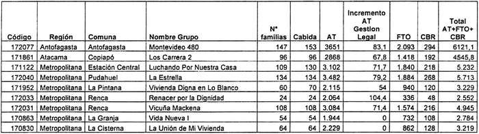 3. Asígnase a los grupos organizados seleccionados en el Resuelvo 2. de la presente resolución, por concepto de pago por los Servicios de Asistencia Técnica, por las Labores de Fiscalización Técnica de Obra y pago de aranceles al Conservador de Bienes Raíces para el desarrollo de sus proyectos, los montos expresados en Unidades de Fomento que se detallan a continuación: