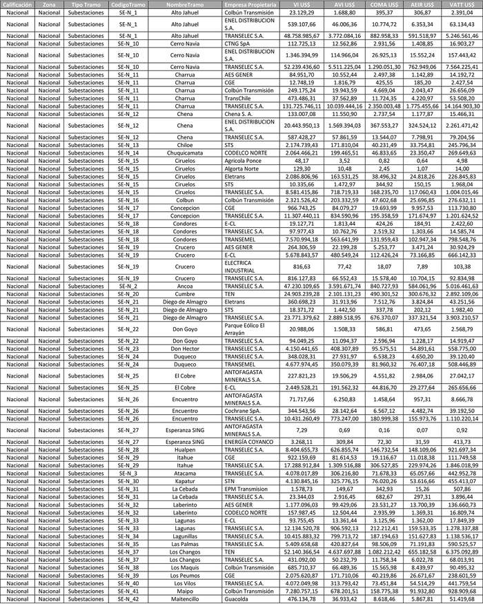 Artículo primero: Fíjanse el Valor de Inversión ("V.I."), la Anualidad del Valor de Inversión ("A.V.I."), Costos de Operación, Mantenimiento y Administración ("C.O.M.A."), Ajuste por Efecto de Impuesto a la Renta ("A.E.I.R.") y Valor Anual de la Transmisión por Tramo ("V.A.T.T."), de las instalaciones de transmisión nacional, zonal y de las instalaciones de transmisión dedicada utilizadas por parte de los usuarios sometidos a regulación de precios, de conformidad a lo establecido en el artículo 112° de la Ley, de acuerdo al siguiente detalle: