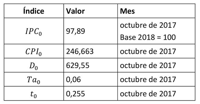 Los valores base de los índices definidos previamente son los que a continuación se indican: