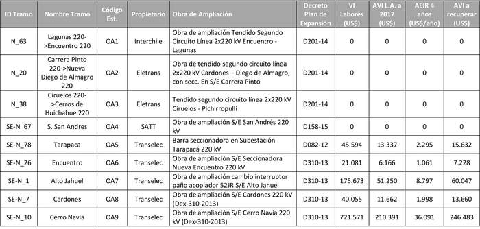 Artículo tercero: Para las obras de ampliación que entraron en operación entre el 1 de enero de 2015 y el 31 de diciembre de 2017, de acuerdo a lo establecido en el Informe Técnico Definitivo de Valorización de las Instalaciones de los Sistemas de Transmisión para el Cuadrienio 2020-2023, aprobado mediante Resolución Exenta N° 118, de 2 de marzo de 2022 y rectificado por la Resolución Exenta N° 199, de 25 de marzo de 2022, ambas de la Comisión, se presenta en la Tabla 5 el V.I. y el A.V.I. de las labores de ampliación de cada obra de ampliación, a ser recuperado en el cuadrienio 2020-2023. El valor de inversión a recuperar se anualizó en cuatro cuotas, utilizando la tasa de descuento, según corresponda, de acuerdo a las disposiciones y lineamientos señalados en el referido Informe Tecnico Definitivo. El A.V.I. a recuperar en el cuadrienio corresponde a la suma del A.V.I. antes mencionado más el A.E.I.R., dando lugar así al A.V.I. ajustado a recuperar en el siguiente cuadrienio.
