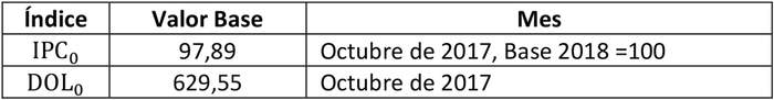 Los valores base para los índices antes definidos, corresponden a los que a continuación se indican: