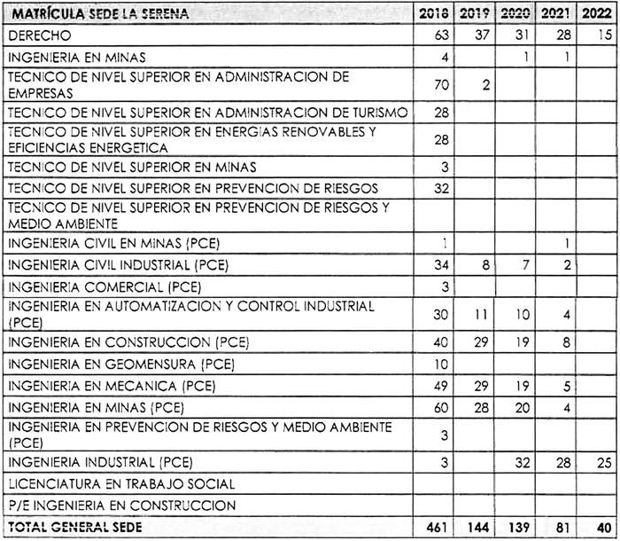 En lo referente a la matrícula total de los últimos 5 años, 2018 - 2022, la Universidad informa sobre el total general de la sede y el detalle por carrera, esta información coincide con lo reportado por SIES:
