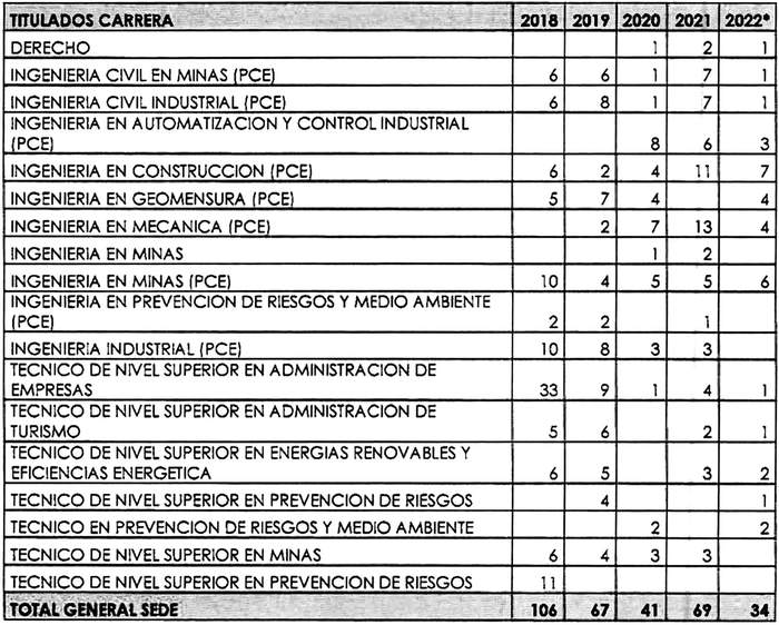 Ahora bien, respecto a la cantidad de estudiantes titulados, durante los últimos 5 años, la Universidad informa el total de la sede y el detalle por carrera, esto coincide con lo informado por SIES: