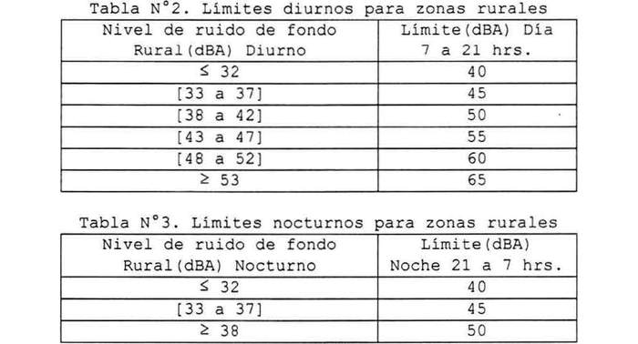 Límites de emisión en zona rural. Para zona rural, los límites de emisión para la fuente fija, para periodo diurno y nocturno serán los establecidos en las Tablas N° 2 y N° 3, respectivamente, de acuerdo al nivel de ruido de fondo rural (NRFR).