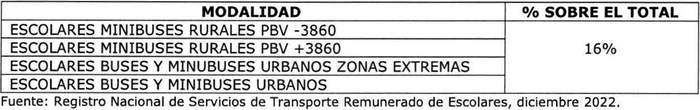 Lo anterior, como se observa en la tabla precedente, implica la salida de un 16 % del total de vehículos inscritos en el Registro Nacional de Servicios de Transporte Remunerado de Escolares, lo que, en caso de no abordar acciones destinadas a disminuir el porcentaje ya señalado, incidirá negativamente en la operación de los servicios, entre ellas los horarios, la periodicidad y la especial regulación de los mismos, causando un grave perjuicio a la comunidad usuaria.
