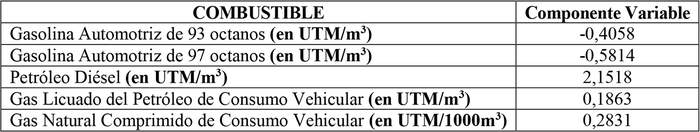 1.- Determínanse los siguientes componentes variables de los impuestos específicos establecidos en la Ley N° 18.502, que Establece impuestos a los combustibles que señala, en virtud de lo señalado en el artículo 3 de la ley N° 20.765: