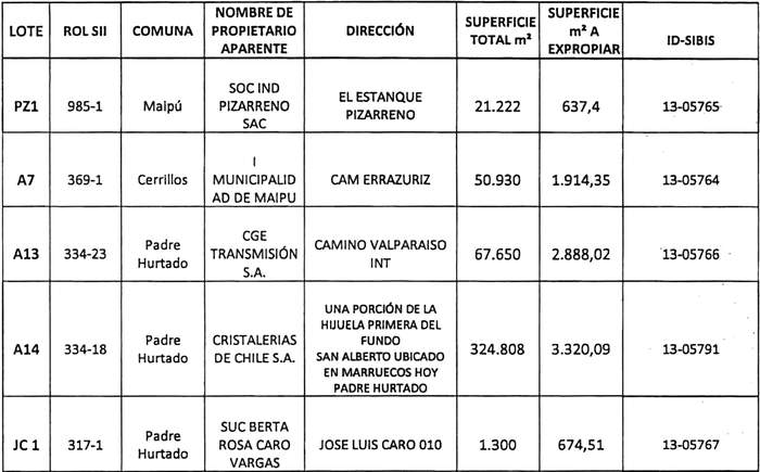 1. Que, el Servicio de Vivienda y Urbanización Metropolitano, mediante los oficios citados en los Vistos e) y f), solicitó a esta Cartera de Estado la elaboración del decreto supremo que apruebe el Programa de Expropiaciones de 26 inmuebles ubicados en las comunas de Maipú, Cerrillos, Padre Hurtado y Peñaflor, de la Región Metropolitana, destinados a la ejecución del Proyecto "Mejoramiento Integral Infraestructura Ferroviaria, Tramo Alameda Melipilla", Código BIP 40019826-0, el cual considera una superficie total aproximada a expropiar de 18.125,85 metros cuadrados.