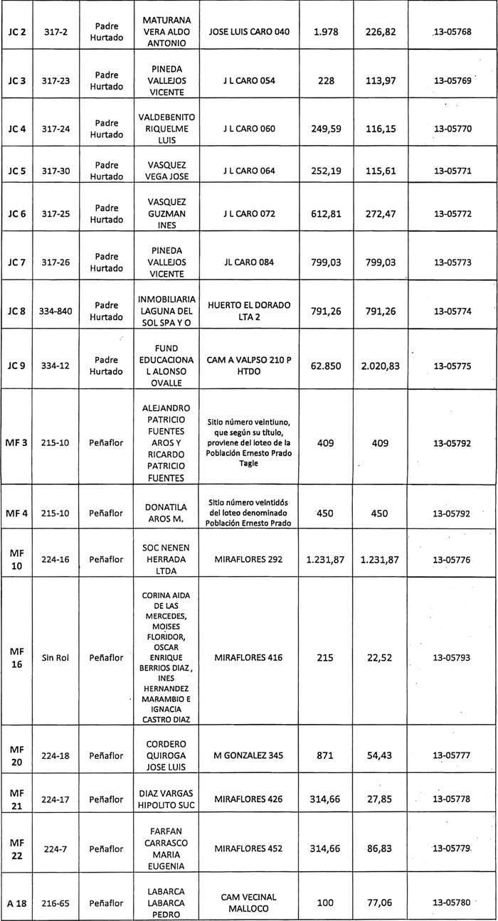 g) Los Informes Técnicos DDUI, suscritos por el Jefe del Departamento de Desarrollo Urbano e Infraestructura de la Secretaría Regional Ministerial de Vivienda y Urbanismo de la Región Metropolitana contenidos en: la Ficha de Evaluación de Terrenos N° 94-2022, correspondiente al Lote PZ 1 (Rol de Avalúo 985-1, comuna de Maipú); la Ficha de Evaluación de Terrenos N° 87-2022, correspondiente al Lote A-7 (Rol de Avalúo 369-1, comuna de Cerrillos); la Ficha de Evaluación de Terrenos N° 90-2022, correspondiente al Lote A 13 (Rol de Avalúo 334-23, comuna de Padre Hurtado) y al Lote A 14 (Rol de Avalúo 334-18, comuna de Padre Hurtado); la Ficha de Evaluación de Terrenos N° 91-2022, correspondiente al Lote JC 1 (Rol de Avalúo 317-1, comuna de Padre Hurtado), Lote JC 2 (Rol de Avalúo 317-2, comuna de Padre Hurtado), Lote JC 5 (Rol de Avalúo 317-30, comuna de Padre Hurtado), Lote JC 6 (Rol de Avalúo 317-25, comuna de Padre Hurtado), Lote JC 7 (Rol de Avalúo 317-26, comuna de Padre Hurtado), Lote JC 8 (Rol de Avalúo 334-840, comuna de Padre Hurtado) y Lote JC 9 (Rol de Avalúo 334-12, comuna de Padre Hurtado); la Ficha de Evaluación de Terrenos N° 61-2022, correspondiente al Lote JC 3 (Rol de Avalúo 317-23, comuna de Padre Hurtado) y al Lote JC 4 (Rol de Avalúo 317-24, comuna de Padre Hurtado); la Ficha de Evaluación de Terrenos N° 14-2023, correspondiente al Lote MF 3 (Rol de Avalúo 215-10, comuna de Peñaflor), Lote MF 4 (Rol de Avalúo 215-10, comuna de Peñaflor), Lote MF 10 (Rol de Avalúo 224-16, comuna de Peñaflor), Lote MF 16 (Rol de Avalúo s/n, comuna de Peñaflor), Lote MF 20 (Rol de Avalúo 224-18, comuna de Peñaflor), Lote MF 21 (Rol de Avalúo 224-17, comuna de Peñaflor), y Lote MF 22 (Rol de Avalúo 224-7, comuna de Peñaflor); la Ficha de Evaluación de Terrenos N° 92-2022, correspondiente al Lote A 18 (Rol de Avalúo 216-65, comuna de Peñaflor) y al Lote A 22 (Rol de Avalúo 225-113, comuna de Peñaflor); y la Ficha de Evaluación de Terrenos N° 14-2023, correspondiente al Lote A 19 A (Rol de Avalúo 309-362, comuna de Peñaflor), Lote A 19 B (Rol de Avalúo 309-694, comuna de Peñaflor), Lote A 19 C (Rol de Avalúo 309-696, comuna de Peñaflor), y al Lote A 19 D (Rol de Avalúo 309-695, comuna de Peñaflor);