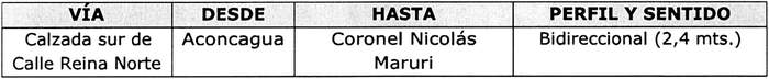 1. Apruébase el proyecto de ciclovía denominado: "Calle Reina Norte", cuyo interesado es Cooperativa Abierta de Viviendas Conavicoop Ltda, a emplazarse en la vía, tramo, sentido de tránsito y perfil que se indica en el siguiente cuadro: