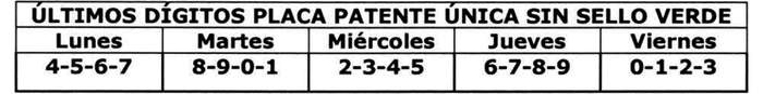 b) Automóviles, station wagons y similares, sin sello verde, motocicletas y similares de años anteriores al año 2002; fuera del perímetro delimitado por el anillo Américo Vespucio, pero dentro de la provincia de Santiago y comunas de San Bernardo y Puente Alto, de lunes a viernes, excepto festivos, entre las 7:30 y las 21:00 horas, según su último dígito de placa patente, conforme el siguiente calendario semanal: