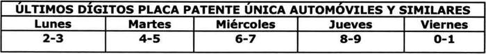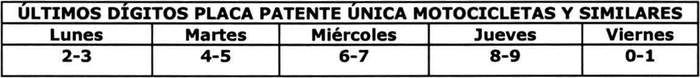 f) Motocicletas y similares, inscritos en el Registro Nacional de Vehículos Motorizados antes del 1 de septiembre de 2010; de lunes a viernes, excepto festivos, entre las 7:30 y las 21:00 horas, dentro de la provincia de Santiago y comunas de San Bernardo y Puente Alto, según su último dígito de placa patente, conforme al siguiente calendario: