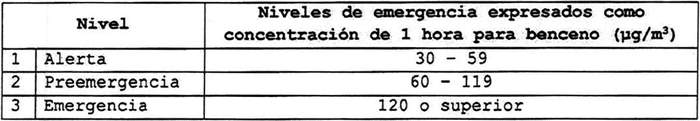 Artículo 5. Los siguientes niveles originarán situaciones de emergencia ambiental para benceno, expresados como concentración de 1 hora: