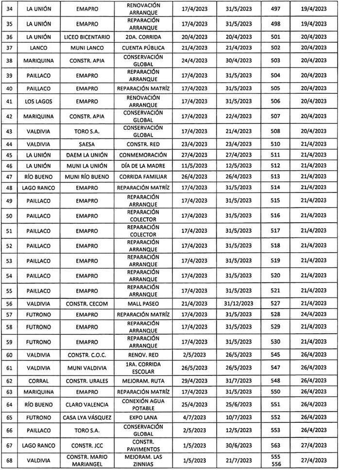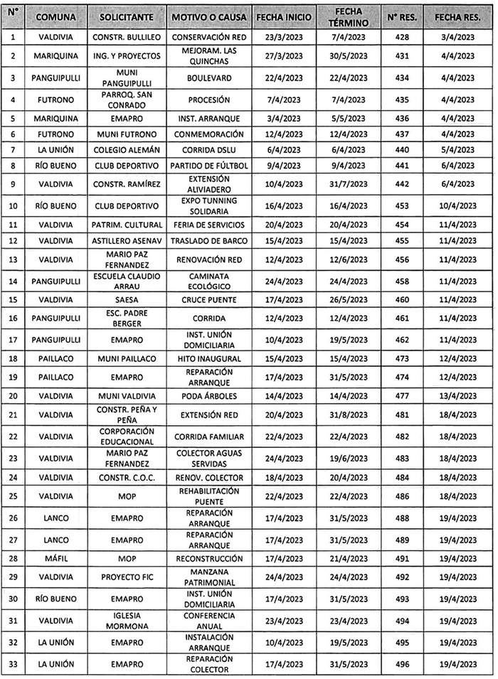 De acuerdo con el formato y lo instruido por el Ministerio de Transportes y Telecomunicaciones, el Gobierno Regional de Los Ríos publica las resoluciones exentas mes abril año 2023, N° 428, 431, 434, 435, 436, 437, 440, 441, 442, 453, 454, 455, 456, 458, 460, 461, 462, 473, 474, 477, 481, 482, 483, 484, 486, 488, 489, 491, 492, 493, 494, 495, 496, 497, 498, 501, 502, 503, 504, 505, 506, 507, 508, 510, 511, 512, 513, 514, 515, 516, 517, 518, 519, 520, 521, 527, 528, 529, 530, 545, 547, 548, 550, 551, 552, 553, 555, 556, 563 en las fechas descritas, prohibió la circulación de vehículos por las vías que se indican y por los motivos que se señalan en el siguiente cuadro: