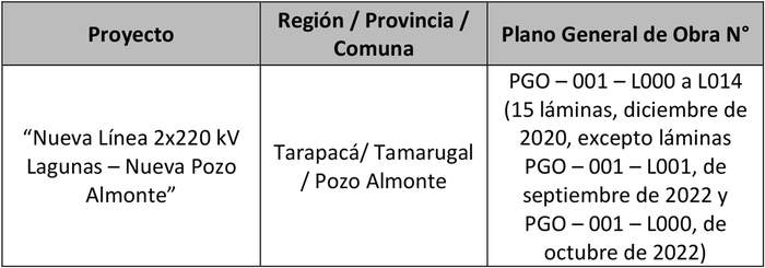 En su recorrido, el proyecto "Nueva Línea 2x220 kV Lagunas - Nueva Pozo Almonte" afectará las líneas eléctricas, obras e instalaciones existentes que se indican a continuación: