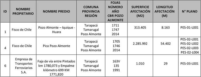 Artículo 7º.- Constitúyanse, de acuerdo con lo que sobre el particular establece la Ley General de Servicios Eléctricos, las servidumbres para el establecimiento del proyecto "Nueva Línea 2x220 kV Lagunas - Nueva Pozo Almonte", en los predios que se indican a continuación: