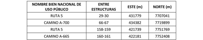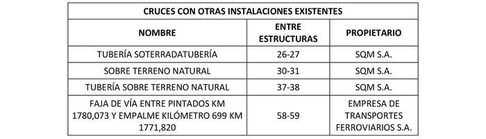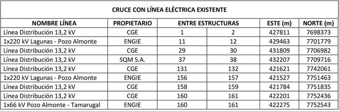 Finalmente, durante su recorrido la línea proyectada, presenta un paralelismo con la línea 1x220 kV Lagunas - Pozo Almonte de propiedad de la empresa ENGIE, de acuerdo con lo dispuesto en la NSEG 6 E.n.71., Cruces y Paralelismos de Líneas Eléctricas de la Superintendencia de Electricidad y Combustibles, normativa vigente a la fecha de ingreso de la solicitud de concesión.
