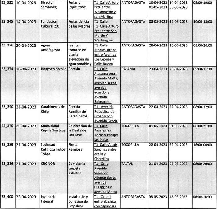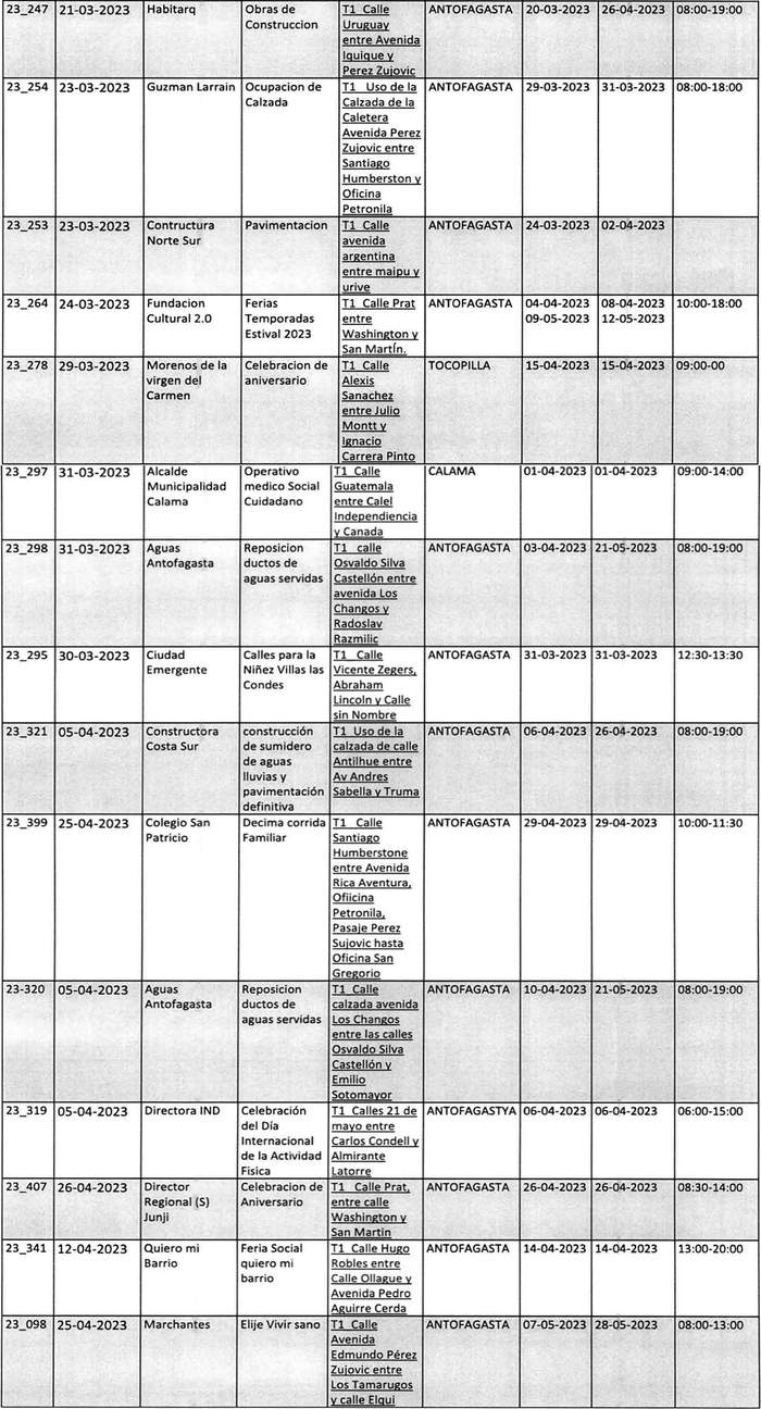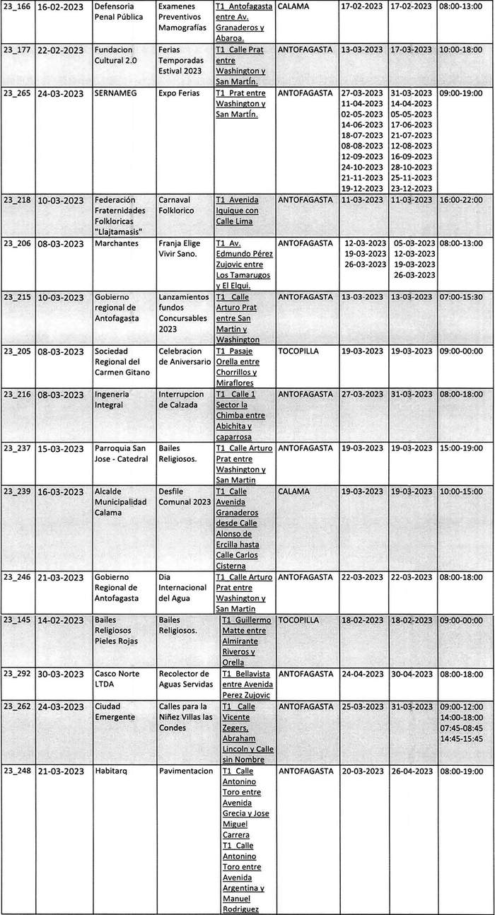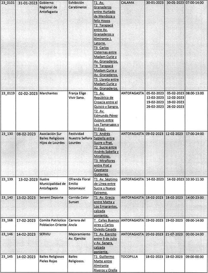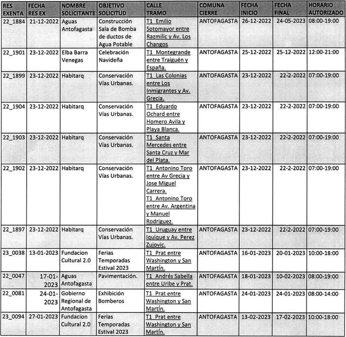 De acuerdo con el formato y lo instruido por el Ministerio de Transportes y Telecomunicaciones. El Gobierno Regional de Antofagasta, publica las resoluciones exentas N°s. 1.884, 1.901, 1.899, 1.904, 1.903, 1.902 y 1.897 del año 2022. Además, las resoluciones exentas N°s. 38, 47, 81, 94, 101, 119, 130, 139, 140, 168, 146, 145, 166, 177, 265, 218, 206, 215, 205, 216, 237, 239, 246, 250, 263, 292, 262, 248, 247, 254, 253, 264, 278, 297, 298, 295, 321, 399, 320, 319, 407, 341, 098, 332, 345, 376, 374, 390, 375, 389, 386 y 400. En las fechas descritas, prohibió la circulación de vehículos por las vías que se indican y por los motivos que se señalan en el siguiente cuadro: