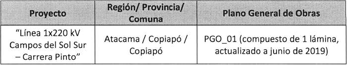 Artículo 2º.- El proyecto "Línea 1x220 kV Campos del Sol Sur - Carrera Pinto", tiene por objeto ayudar en la evacuación de la energía generada por el Parque Fotovoltaico Campos del Sol Sur. La "Línea 1x220 kV Campos del Sol Sur - Carrera Pinto", será de simple circuito en 220 kV, tendrá una potencia proyectada de evacuación de 420 MVA y su longitud será de 7.431,55 metros. La longitud total a concesionar es de 7.389,68 metros, medidos entre los límites prediales de las Subestaciones. La longitud que se solicita concesionar, se justifica toda vez que ésta se extiende entre el punto ML-1 (Coordenadas: Este 408.878,04 metros; Norte 7.007.297,88 metros Datum WGS 84 H19) hasta el punto PT (Coordenadas: Este 410.335,38 metros; Norte 7.013.213,04 metros Datum WGS 84 H19), ya que no se pide concesión eléctrica sobre los predios donde están ubicadas la Subestación Elevadora Campos del Sol Sur (proyectada) y la Subestación Carrera Pinto (existente).