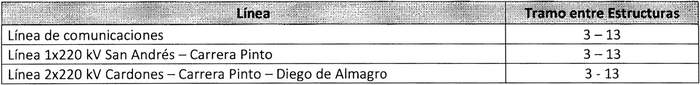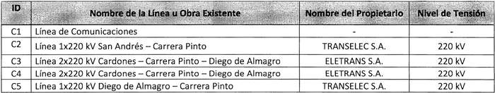 Artículo 8º.- En su recorrido, el proyecto "Línea 1x220 kV Campos del Sol Sur - Carrera Pinto" afectará las líneas eléctricas, obras e instalaciones existentes que se indican a continuación: