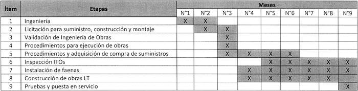 Artículo 11º.- El plazo de construcción desde el inicio de los trabajos hasta la terminación total de las obras será de nueve meses, considerando el inicio de ellas después de treinta días de la reducción a escritura pública del decreto que otorgue la concesión. A continuación, las etapas y secciones de actividades de la obra: