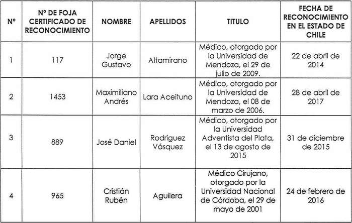 Artículo segundo: Reconócese en el marco del "Acuerdo de Reconocimiento Mutuo de Títulos Profesionales y Licenciaturas y Títulos de Grado Universitarios entre la República de Chile y la República Argentina", suscrito el 16 de marzo de 2012, los títulos de grado obtenidos en las universidades argentinas que se indican a continuación: