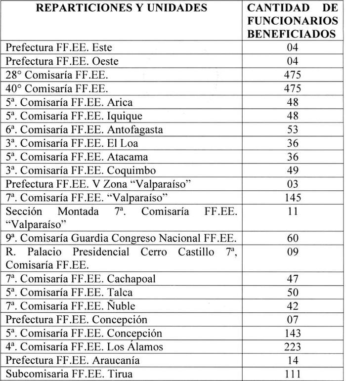 2°.- Fíjase, para el año 2023, en 3.213 (tres mil doscientos trece), el número de beneficiarios, los que deben prestar servicios en las Reparticiones y Unidades de Fuerzas Especiales, cuyo detalle se señala a continuación: