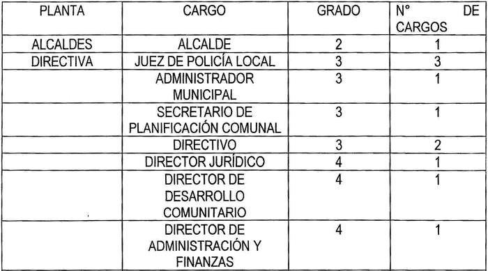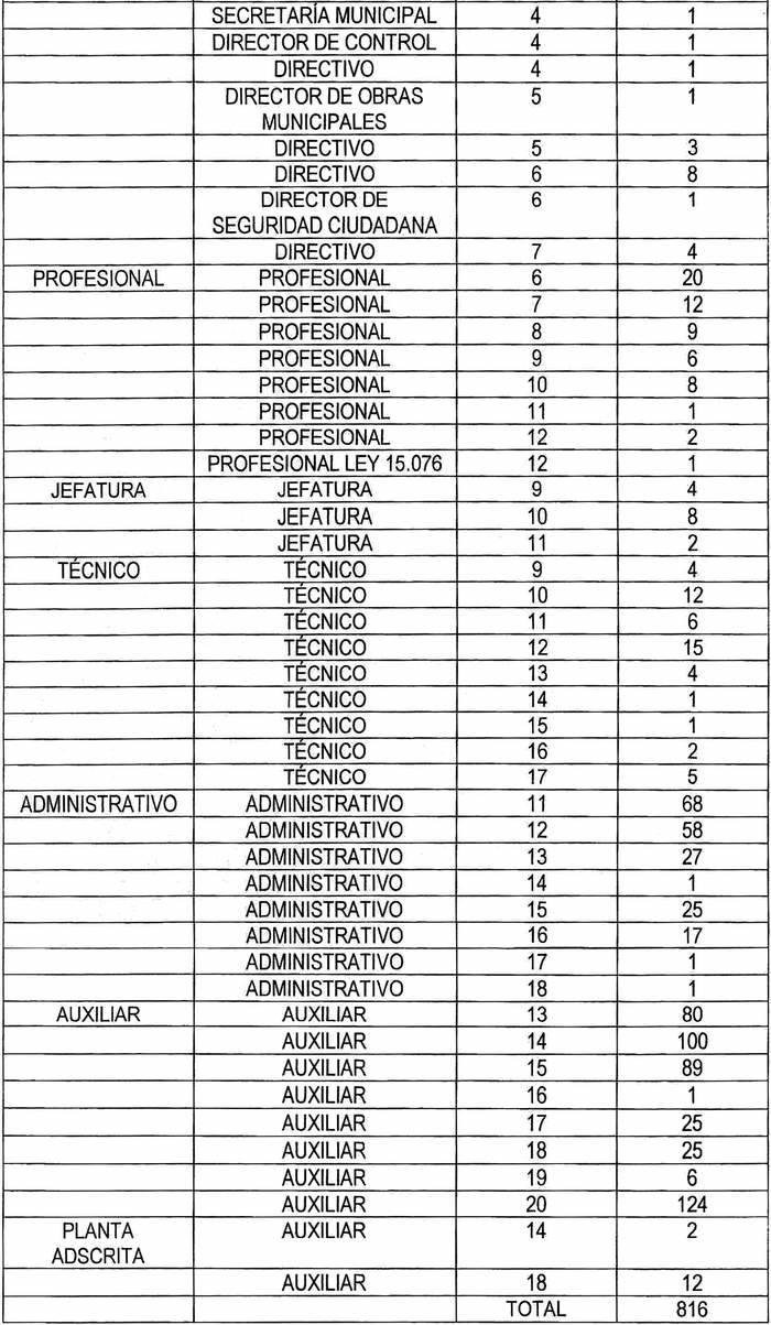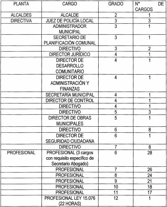 Artículo 4º: Fíjese la Planta del Personal de la Ilustre Municipalidad de Valparaíso, la cual quedará compuesta de los escalafones, cargos y grados que a continuación se detallan: