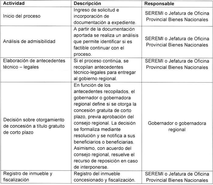 c) Las etapas o actividades que la administración ejecuta para el otorgamiento de las referidas concesiones se realizarán por el gobierno regional o la respectiva Seremi de acuerdo al siguiente detalle: