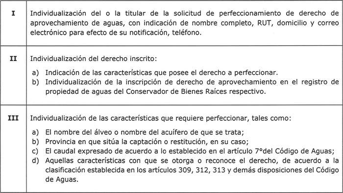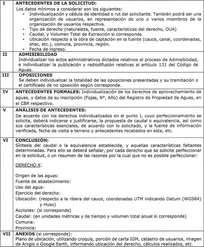 Cuadro 1 Requisitos específicos mínimos para la presentación de la solicitud de perfeccionamiento de derecho de aprovechamiento de aguas