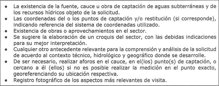 De ser necesario realizar una visita a terreno ésta deberá efectuarse siguiendo el procedimiento general señalado en el punto 2.8 del capítulo IV de Normas Comunes, si corresponde, y coordinarse previamente con el solicitante, con el objeto de verificar, por ejemplo, las coordenadas de ubicación del punto de captación del derecho de aprovechamiento si existen dudas respecto de su replanteo en gabinete; aforos si no se tienen antecedentes de caudales en la fuente, y capacidad de porteo de canales en bocatomas, y otros que sean necesarios con el fin de informar adecuadamente.