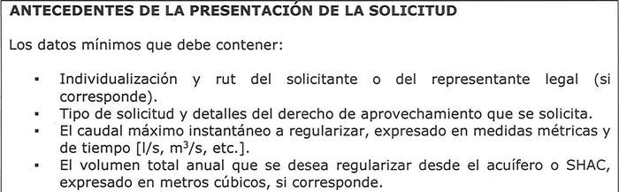 Solicitud elaborada por el interesado o por el representante legal, en su caso, presentada ante las oficinas de la Dirección General de Aguas respectiva, la que debe contener al menos lo siguiente: