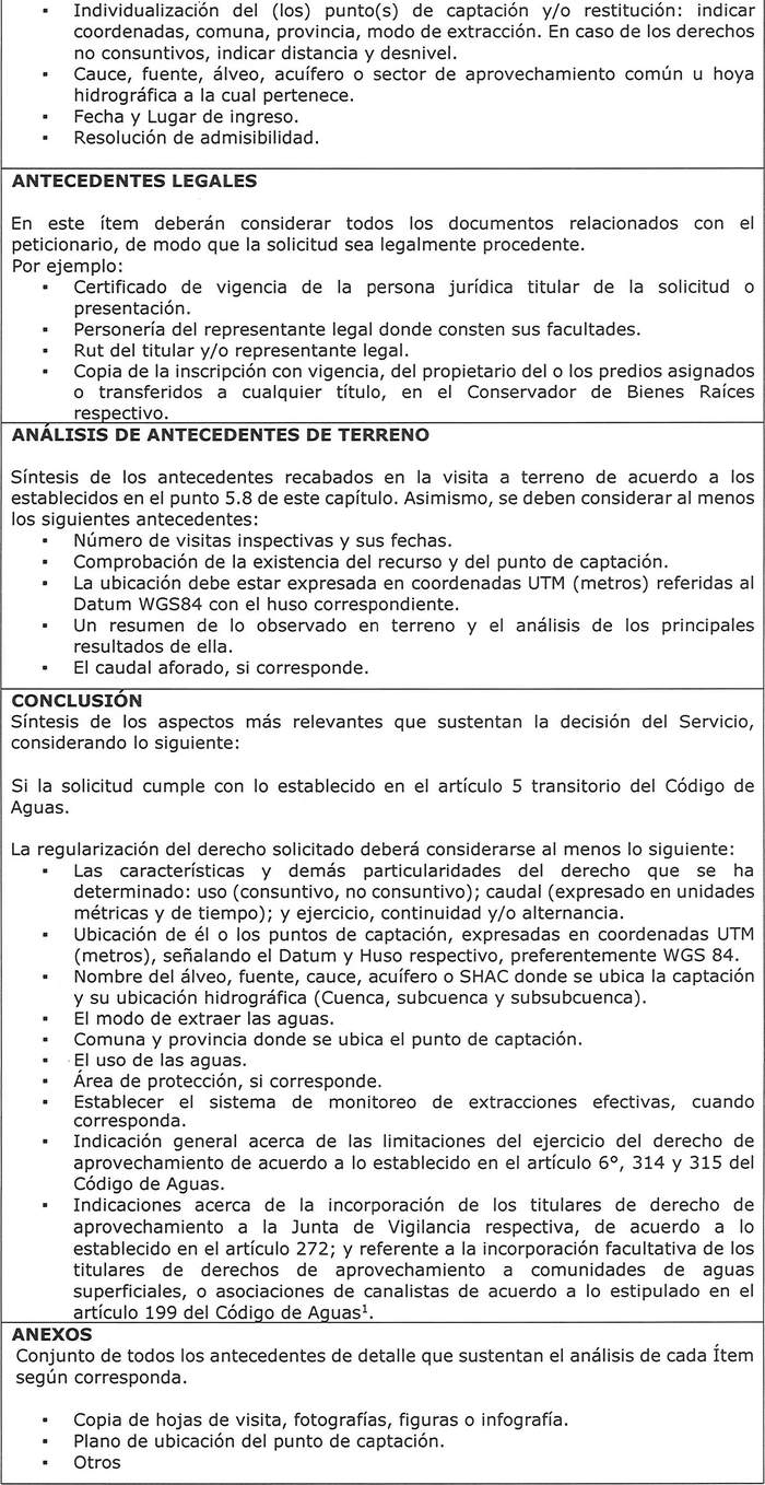 Basada en las conclusiones del Informe Técnico, la Dirección General de Aguas procederá a emitir resolución fundada que determina el derecho de aprovechamiento cuya regularización se ha solicitado, y debe cumplir con los requisitos del artículo 149 del Código de Aguas, de acuerdo con lo siguiente: