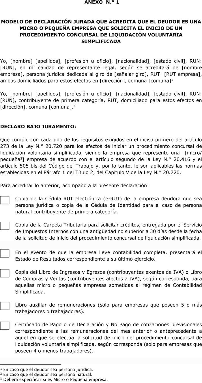 Artículo 1°. Modelo. Para el cumplimiento de lo previsto en el artículo 273 de la ley N° 20.720, los deudores que soliciten el inicio de un procedimiento concursal de liquidación voluntaria simplificada deberán presentar una declaración jurada con la que se acreditará la circunstancia de ser una Empresa Deudora que califica como micro o pequeña empresa de acuerdo al artículo segundo de la ley N° 20.416 y al artículo 505 bis del Código del Trabajo, cuyo modelo se encuentra contenido en el Anexo N° 1 de la presente Norma.