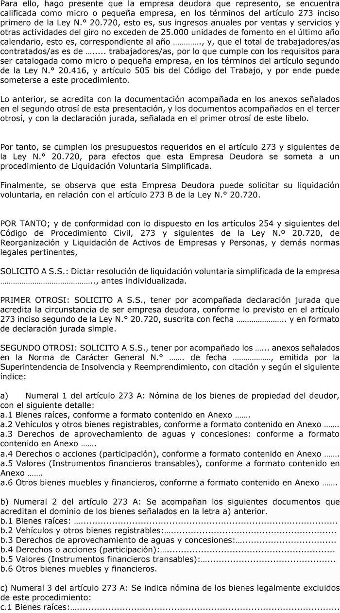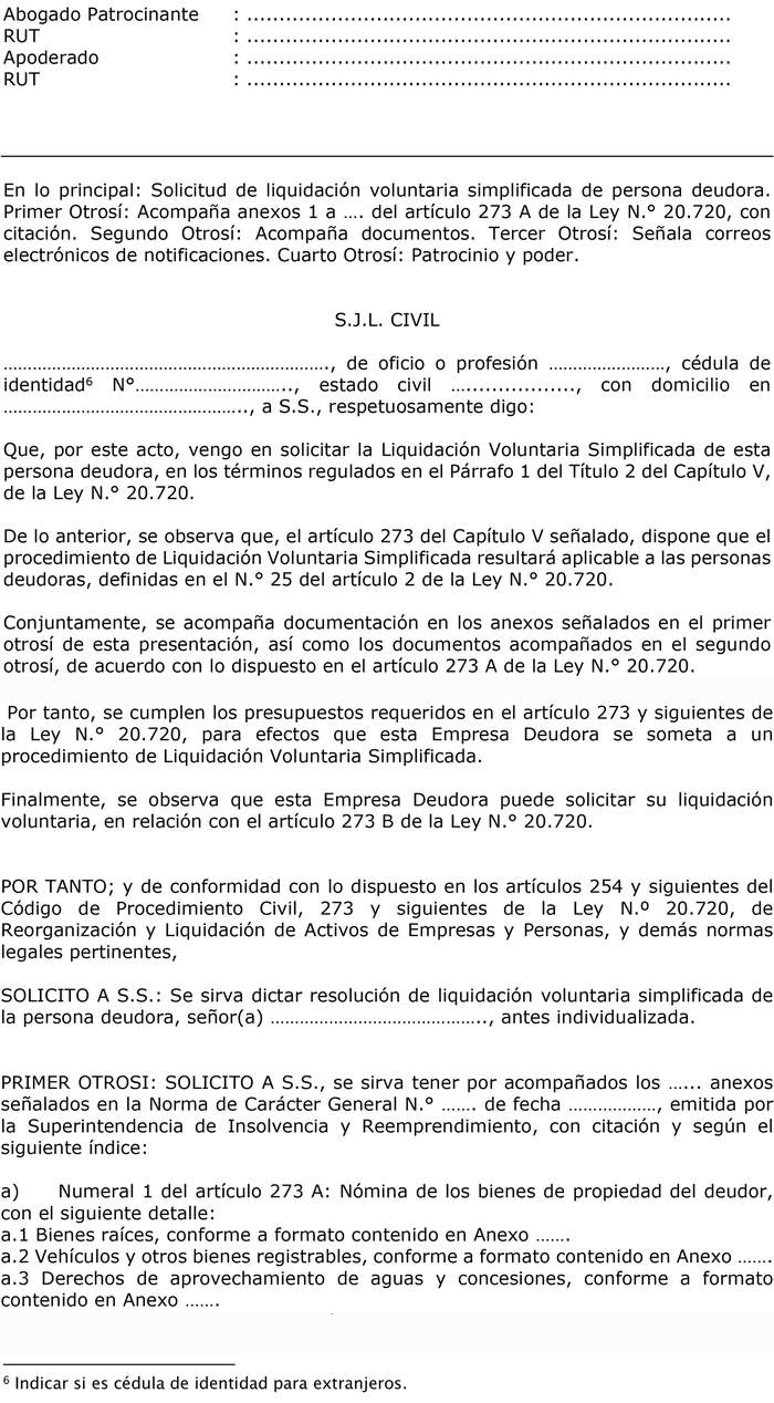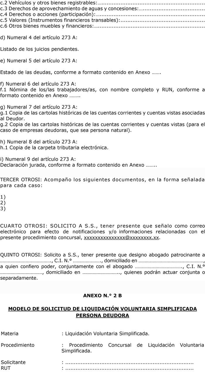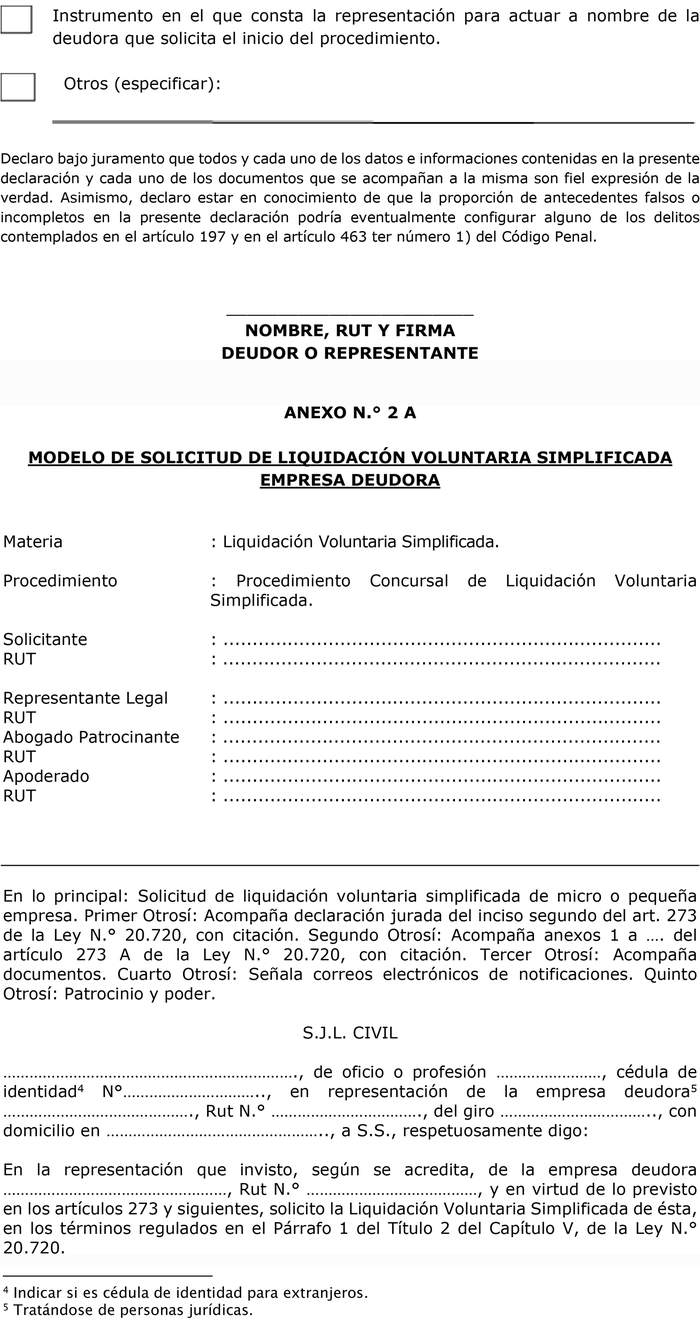 Artículo 6°. De conformidad a lo dispuesto en el inciso tercero del artículo 273 A de la ley N° 20.720, la solicitud de liquidación voluntaria simplificada, deberá cumplir con el modelo contenido en el Anexo N° 2A, para el caso de empresa deudora y Anexo N° 2B, para el caso de persona deudora, y además considerar lo siguiente:
