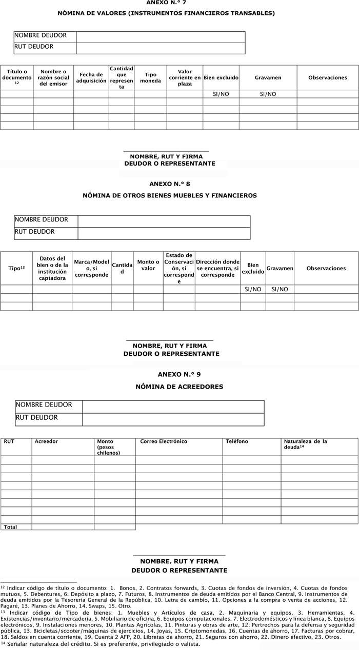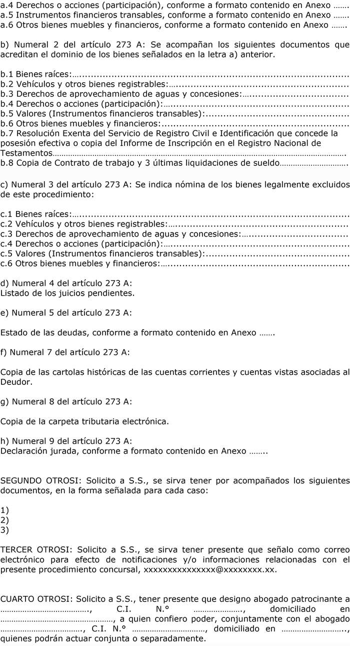 Para estos efectos, en Anexo N° 9 se adjunta el formato que se deberá acompañar en otrosí de la solicitud de liquidación, para informar el estado de deudas.