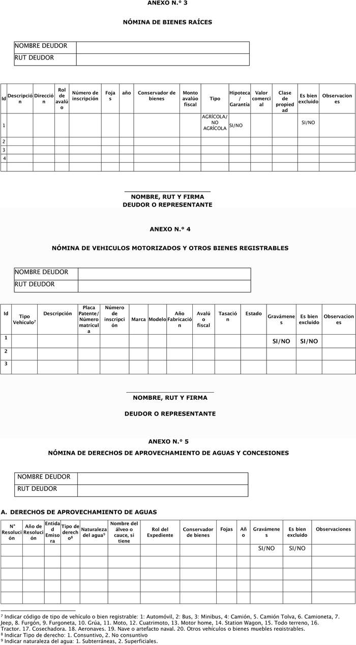 1° Apruébase la siguiente Norma de Carácter General, que, en el nuevo procedimiento concursal de Liquidación Voluntaria Simplificada, regula el modelo de la declaración jurada por la cual el deudor podrá acreditar la circunstancia de ser una empresa deudora de aquellas señaladas en el artículo 273 de la ley N° 20.720 y el formato y contenido de la solicitud de Liquidación Voluntaria Simplificada según lo prescrito en el artículo 273 A de la misma norma y sus anexos, denominados Anexo N° 1 "Modelo de Declaración Jurada que acredita que el deudor es una micro o pequeña empresa que solicita el inicio de un procedimiento concursal de liquidación voluntaria simplificada", Anexo N° 2 A "Modelo de solicitud de liquidación voluntaria simplificada empresa deudora", Anexo N° 2 B "Modelo de solicitud de liquidación voluntaria simplificada persona deudora", Anexo N° 3 "Nómina de bienes raíces", Anexo N° 4 "Nómina de vehículos motorizados y otros bienes registrables", Anexo N° 5 "Nómina de derechos de aprovechamiento de aguas y concesiones", Anexo N° 6 "Nómina de derechos o acciones (participación) en entidades y comunidades hereditarias", Anexo N° 7 "Nómina de valores (instrumentos financieros transables)", Anexo N° 8 "Nómina de otros bienes muebles y financieros", Anexo N° 9 "Nómina de acreedores", Anexo N° 10 "Nómina de trabajadores/as" y Anexo N° 11 "Modelo de declaración jurada que acredita que los antecedentes son completos y fehacientes", cuyos textos se adjuntan a la presente resolución y forman parte integrante de la misma: